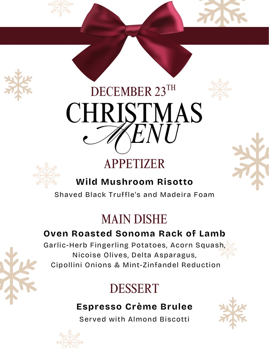 Since we’ll be closed on December 24th and 25th, we invite you to celebrate the season early with an evening full of warmth, flavor, and holiday cheer at Market Restaurant. Join us on Tuesday, December 23rd for an unforgettable three-course Christmas Dinner in the heart of St. Helena.